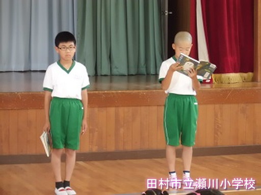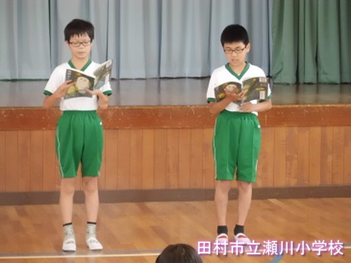 1人が現代文で読んだあと、もう一人が古文で読むというようにみんなに分かりやすく工夫し発表しました。発表後、聞いていた児童から「難しい文章をすらすら読んでいるのでびっくりした。」「上手に読めていた。」といった感想が出されました。