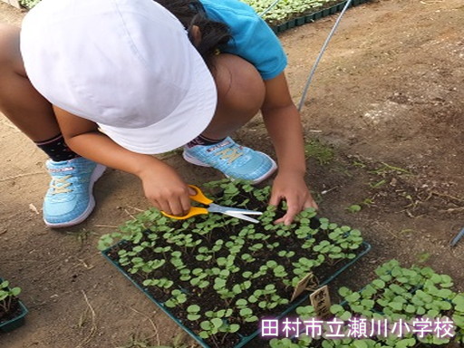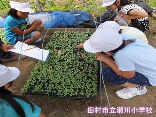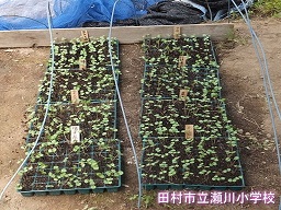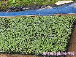 6月16日(火)、エゴマ栽培の指導をいただいている近所のお宅を3年生が訪問しました。6月4日(木)に種まきしたエゴマは、すっかり芽を出し、こんなに大きくなっていました。それぞれの苗には、名札を付けていただいていたので、誰が植えたものか一目で分かります。