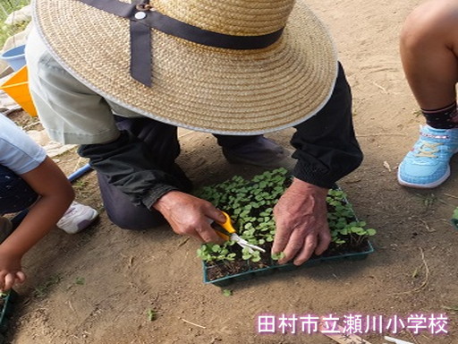 今日の訪問の目的は、「間引き」です。一箇所から多くの苗が出ている物を、間引きをしてよく育つようにする作業です。ハサミを使って間引きします。まず、エゴマの先生に手本を見せていただきました。