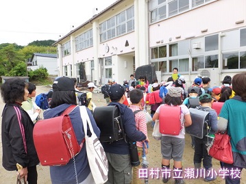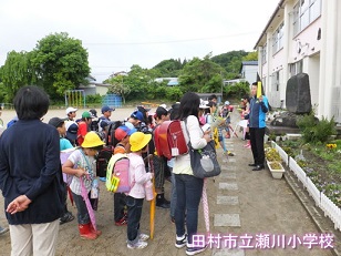 毎日、4時15分前になると、「めだかの学校」で活動していた子、6校時の授業が終わり、帰りの会を終えた子ども達が、班長を先頭に、校舎前に登校班ごとに集合します。子どもたちの周りには、めだかの先生や、学校の先生がいます。週番の先生が、子どもたちの前に出て、お話をします。今日は、「メディアチャレンジシート」について、指導しているようです。その後、当番の子どもたちが前に出てさよならのあいさつをし、下校となります。先生方は、下校する子ども一人一人に声をかけます。めだかの先生は、子ども達がバスに乗るまで引率してくださいます。瀬川小学校の毎日の下校の様子です。