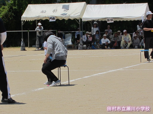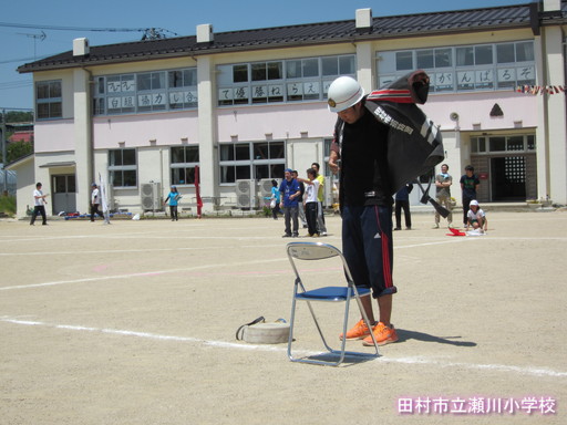 婦人会や消防団の方々も運動会に参加してくださいました。地区対抗紅白リレーの他、消防団は「さあ!出動!」という種目、婦人会は「けつ圧測定」(写真がわかりづらいですが・・・)という種目です。この種目の勝敗も地区の紅白対抗の得点として加算されました。