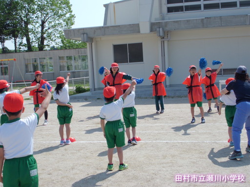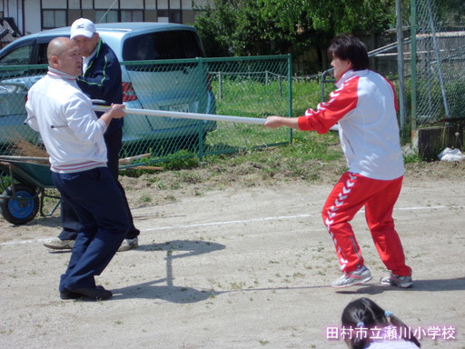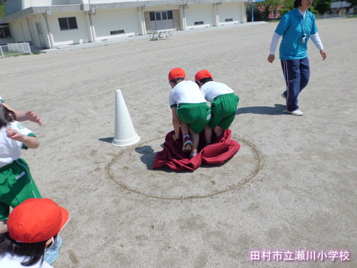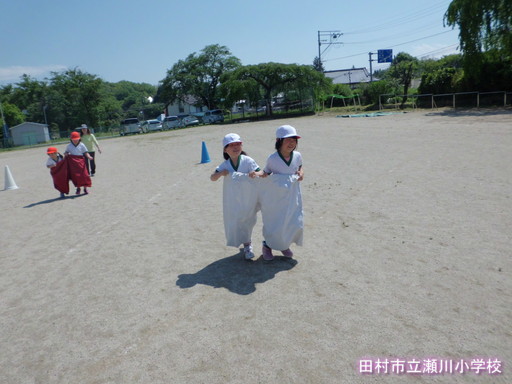 「それいけ!デカパン」1~3年生の運動会親子種目です。どんな競技か、お家の人はいませんが、子ども同士で体験してみました。デカパンは、はいたり脱いだりするのが結構大変です。また、二人調子を合わせて前へ進むのもなかなか大変です。でも、子どもたちは、一生懸命相手チームに勝つようがんばっていました。運動会当日、お家の方とペアで競技できるのを楽しみに待っています。
