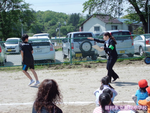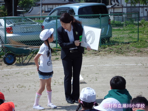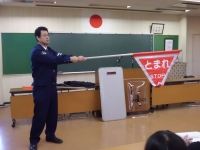 5月14日、2校時目に田村警察署より、2名の講師の先生をお招きし不審者対応訓練を実施しました。 教室に不審者が侵入してきたという想定の下、子どもたちは、す早くにげ、職員が不審者に対応しました。子どもたちは全員、短時間に避難することができました。講評の中では、大変よくできたこと、また、これからも先生の指示をよく聞いて避難することが大切だということを教えていただきました。その後、校庭で、全体指導がありました。「いかのおすし」「いか」・・・知らない人についていかない。(知っている人にもついていかない)「の」・・知らない人の車にのらない。「お」・・・おお声で知らせる。 「すし」・・・・「すぐに、大人の人にしらせる」を確認し、実際に声をかけられたらどのように対応するか、代表児童がみんなの前でやってみました。とても上手にできたので、講師の先生に誉めていただきました。先生方も刺股(さすまた)の使い方をご指導いただきました。とても有意義な訓練になりました。