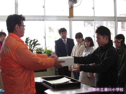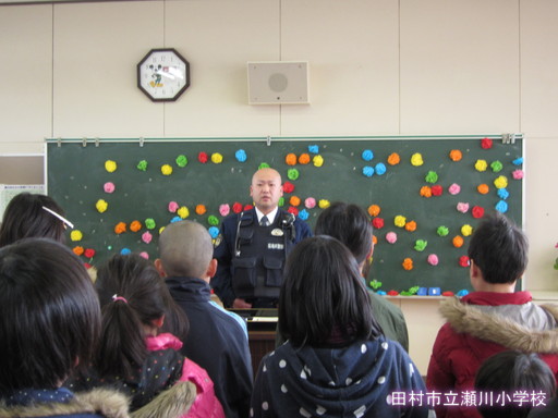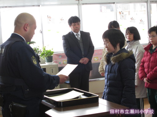 第1回交通教室を行いました。講師に瀬川駐在所長様 交通安全協会瀬川分会長様をお迎えしました。瀬川分会長様から集団登下校で使う呼子が通学班の班長さんに渡されました。その後、瀬川駐在所長様から「家庭の交通安全推進委員」の委嘱状が6年生に授与されました。お二人の講師の方から、集団登校の際の呼子の使い方や自動車が近づいてきたときは、運転手さんの様子をよく見ること、様子が変な時はすぐに逃げること、その他、自転車に乗る際はヘルメットを着用することなどのお話がありました。校長からは、集団登下校のルールを確認し、それをしっかり守る事。運転手さんと仲良くなること。そのためには、横断する際に停まっていただいた運転手さんに、立ち止まってしっかり礼をする事。歩いている際も、運転手さんの顔を見てアイコンタクトを取ることなどの話をしました。その他に、瀬川小には、交通安全のための様々なきまりが各通学班ごとにあります。先輩から受け継いだ「安全のためのきまり」をしっかり守り受け継ぐことなどの話をしました。その後、学校周辺を通学班ごとに歩く練習をしました。どの班も、列を乱すことなく上手に歩くことができました。そして、給食を食べて早めの下校。午前中に学習した事を生かして、地区担当の先生の引率の下、集団下校をしました。平成27年度も交通事故「0」を必ず達成したいと思います。