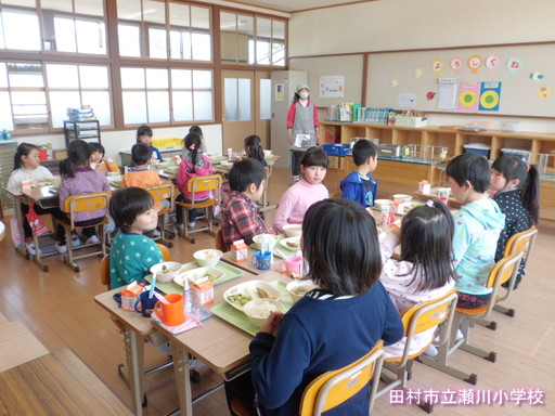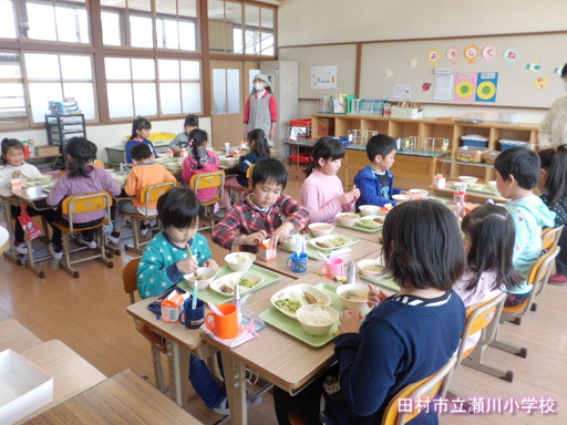 今年から、1年生から3年生は、多目的室で一緒に給食を食べることにしました。「一緒に食べると、おいしい!」と言う声がたくさん聞かれます。新入生3名もとても嬉しそうです。