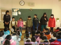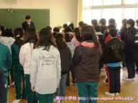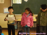 全校朝会では始めに、校長先生より「一人一人、今年の目標を決めたと思います。目標を達成するためには挫けないで努力を続けること。」とお話がありました。次に各学年の代表児童が今年の抱負を発表しました。発表の仕方、その他の児童の話の聞き方もきちんとしていて、新年を迎えた意気込みが感じられました。