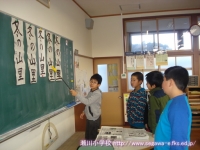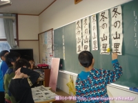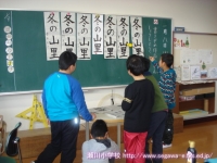 4年生は書き初めの鑑賞学習を行いました。冬休み前に学校で書いたものと冬休み中家で書いたものを一人ずつ黒板に貼りました。一番良いと思う作品を示して、その理由を説明しました。点画の接し方や文字の大きさ、名前についてもよく見て、全員互いの作品のよさに気づいていました。日本の伝統文化、書写(毛筆)にさらに関心をもってもらいたいと思います。