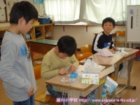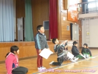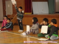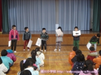 15日の全校集会で,1年生の発表を行いました。国語科で「いろいろなふね」の単元の学習時に好きな乗り物について調べて画用紙にまとめたものを使って,全校生に一人一問ずつクイズにして出しました。自分が調べた「どんなことをするか」と「工夫」を話して,その乗り物は何かを当ててもらいます。2~6年生の上級生が,手を挙げて答えてくれました。発表後の感想で,上級生に「大きな声で話していたからよく分かった。」と褒めてもらって,発表できた1年生もみんな嬉しそうでした。
