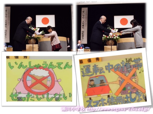 本日、田村地方交通安全大会が、三春交流館「まほら」で行われました。本校からは、2年生と5年生の児童が参加し、「交通安全ポスター最優秀」の表彰を受けました。瀬川小学校も「交通安全優良校」として表彰を受けました。これを機会に、今後、さらに「事故0」に向けて努力していきたいと思います。