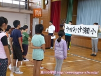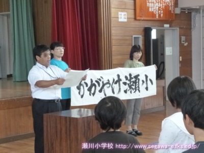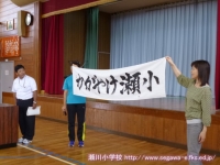 「ホームページで瀬川小の仲間達の活躍を拝見しておりましたら、私も何か応援したくなり横断幕を書いてみました。夏に鍛えた力を十分に発揮できますようエールを送ります。「かがやけ! 瀬小!!」 (泉田先生の手紙から一部抜粋)