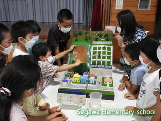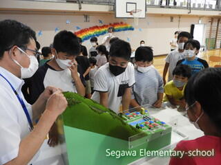 災害の種類や対策などについてお話しを聞いたあと、モデルを使って子どもたちが「地滑り」と「土砂崩れ」の違いを学びました。