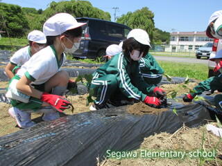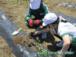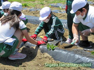 注文していた苗が届いたので、1~4年生が苗を植えました。4年生は何度も経験しているので、ちっちゃな先生として下級生に教えながら一緒に植えます。