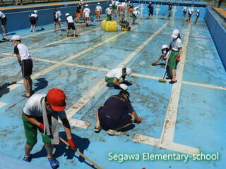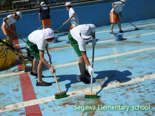 水を抜いたプールは、泥などが積もっています。それを流しながら、デッキブラシやたわしできれいにしていきます。
