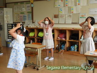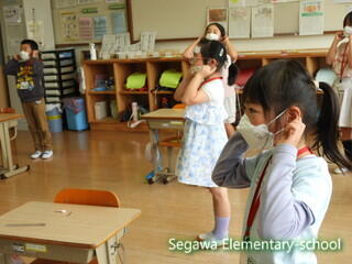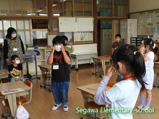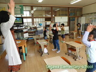 言葉と音楽と身体を使って、楽しく英語を学んでいます。マスクで表情は見えませんが、ニコニコです!
