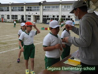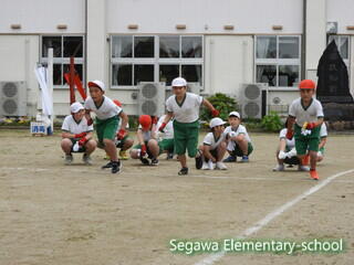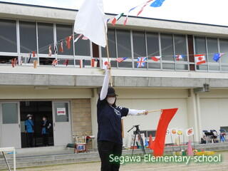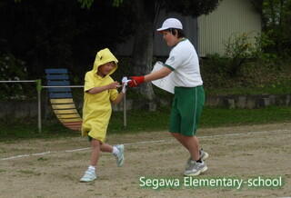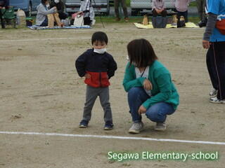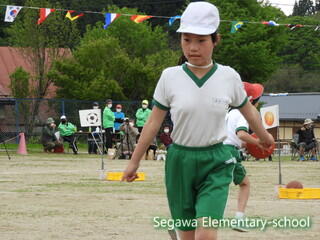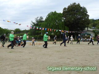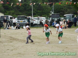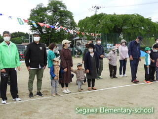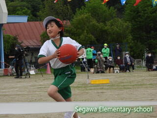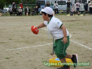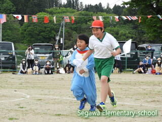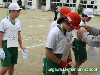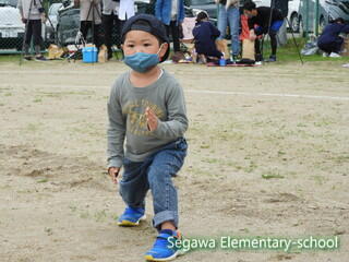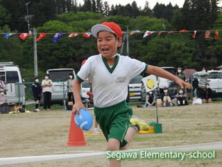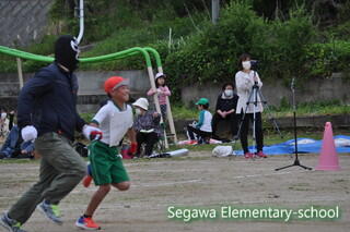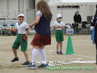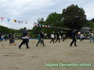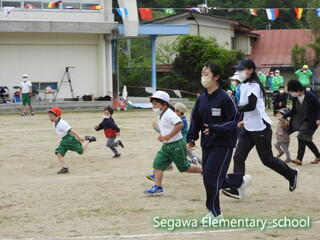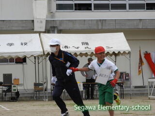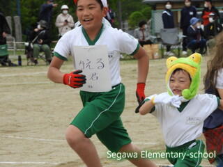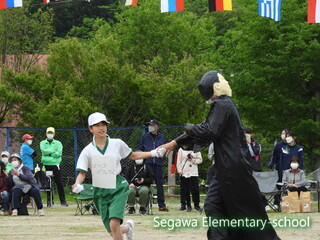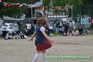 後半の個人種目です。56年生は借り人競争「会いたかった♡」です。スタートして、あの人気グループの曲がかかると・・・かわいらしい服装の大きな体格の“あの人”が登場!! 子供達も大爆笑です。