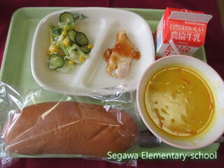 今日の献立は、黒糖パン、ママレードチキン、コーンサラダ、パンプキンポタージュ、牛乳です。