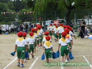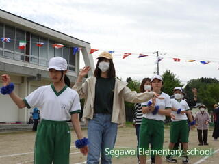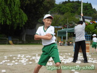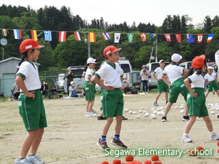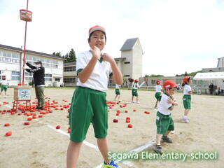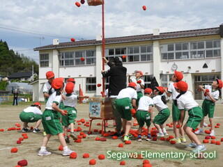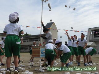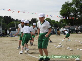 全校生による紅白玉入れは♪チェッ チェッコリ チェッコリ♪に乗って踊り、曲間にダッシュして玉を入れる競技です。