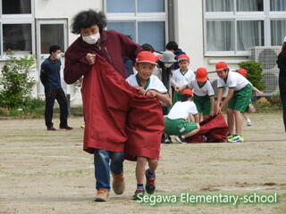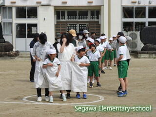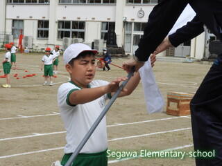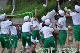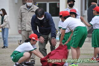 紅白それぞれ、大きなパンツに入ります。56年生は、事前練習をしていてそれぞれで作戦を立てています。