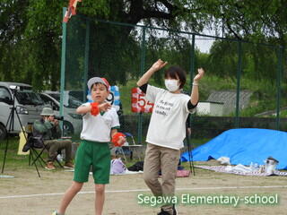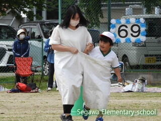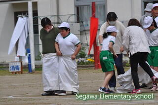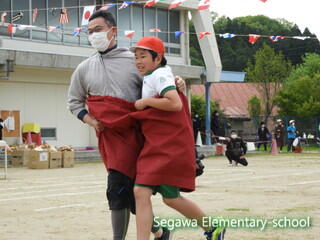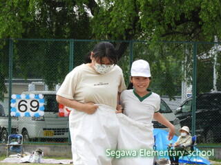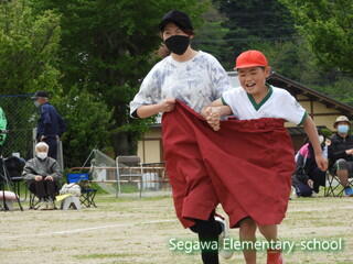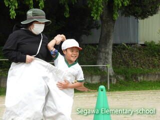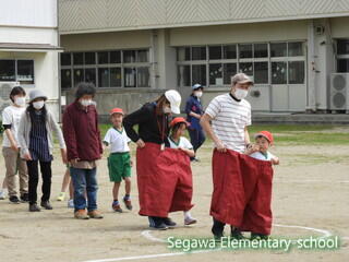 親子競技のデカパン競走です。ご家族はマスク着用、手指消毒の上で参加していただきました。