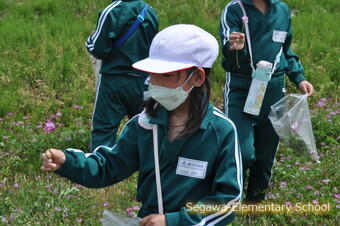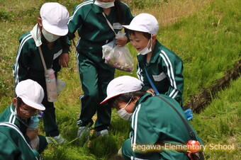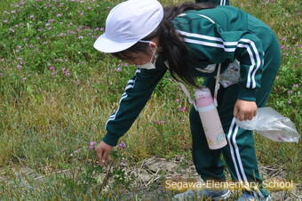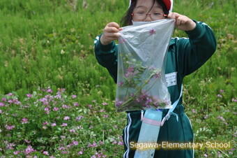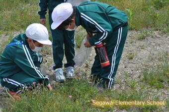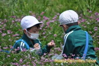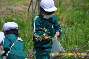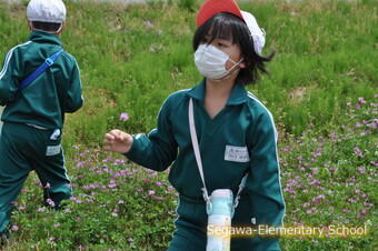 レンゲを摘んで、花束をつくる予定です。草むらには、たくさんの生き物も見られます。