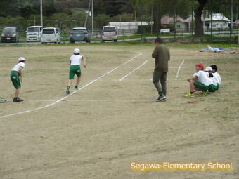 56年生の体育です。ダッシュ練習で走力アップを目指します。