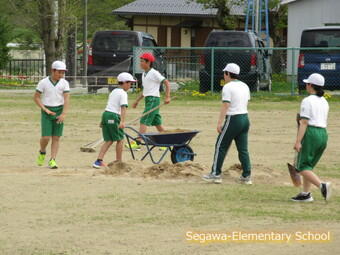 校庭に山砂を入れたので、ならしてもらいました。