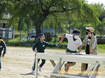 体育主任の号令で左手を挙げる練習!そうしないと次走者にぶつかってしまいます。