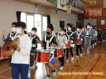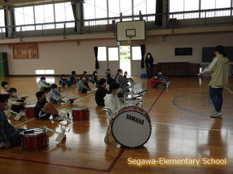 雨上がりの午前中に体育館で鼓笛練習を始めました。
