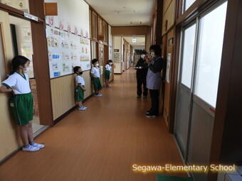 まずは、廊下で視力検査の指し示し方の練習です。このときも互いの距離をとって、感染防止をしています。
