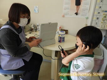 聴力検査は、周囲は静かにしなければなりません。音が聞こえたらボタンを押します。
