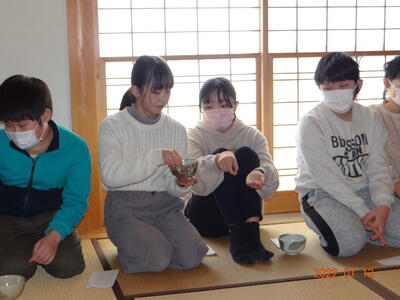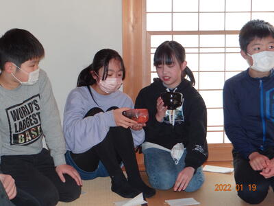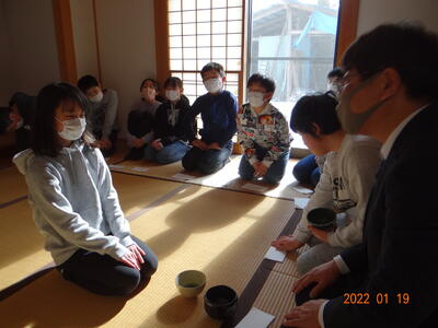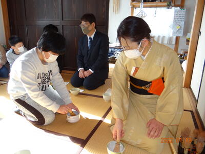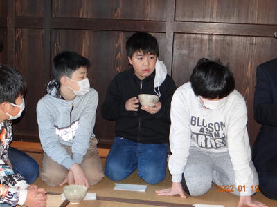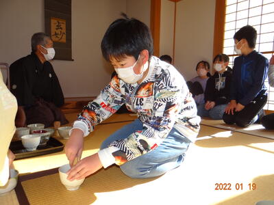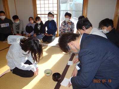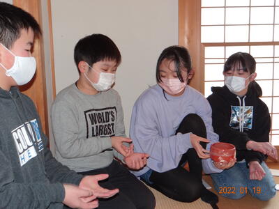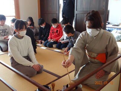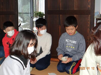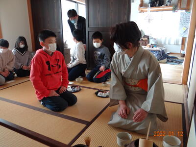 先週に続き、1月19日(水)も、面川様宅で、5・6年生が茶道体験をしました。今回も、面川様とともに、三春町のお菓子屋さんの高橋様もごいっしょに指導してくださいました。おいしいお菓子が、お茶によく合いました。