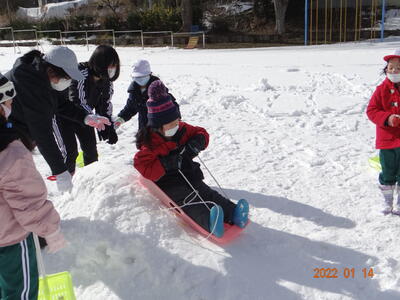 雪を集めて坂をつくり、そりすべりを楽しんだりしました。