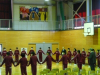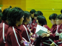会の内容は、毎年恒例のフォークダンスや、色紙と手作りタンブラーのプレゼント、3年間の写真を使ったスライドショー等です。