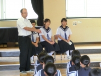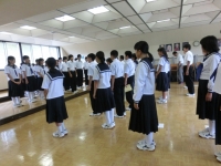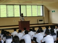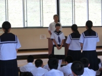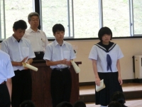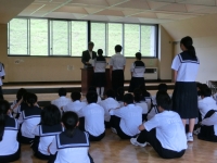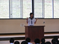 集会の中では、英検やたなばた展の表彰、夏休みの過ごし方についてのお話、少年の主張に出場する生徒の発表がありました。集会後には、服装頭髪検査もありました。
