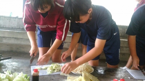 かまどと同時進行で野菜の下準備も始まりました。女子生徒を中心に、こちらは安心して見ていられる感じがしました。