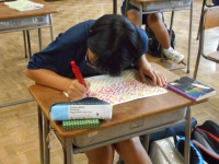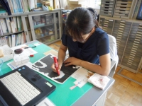 生徒、職員が協力し、全部で140枚のパーツをマジックで染めています。すべてをつなぎ合わせると、紅葉祭当日に大きな一つの作品が完成します。
