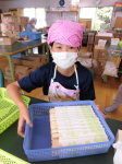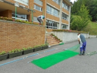校長先生にもお手伝いいただき、昇降口前にアサガオの支柱・ネットを設置しました。