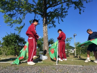 応援がんばり隊の子どもたちは、今日も元気に桃太郎旗を立てております。