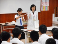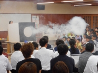児童・生徒・PTAも参加し、液体窒素や空気砲など、科学のおもしろさを体験できる授業でした。