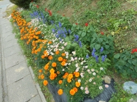 校舎前のアサガオやサルビア、マリーゴールドなどがきれいに咲いています。