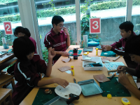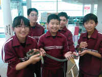 生態系の仕組みを学び、生き物に触れたり、木の端材でオブジェを作ったりしました。