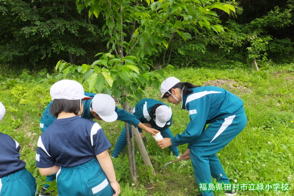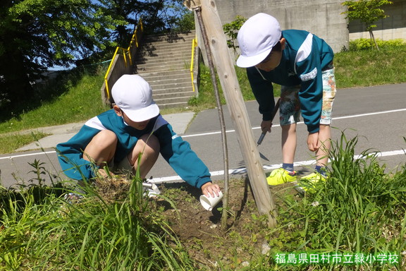 「絆の桜」で人と地域をつなぐ ~緑小学校には「絆の桜」と名付けられた桜の木が学校の周りにたくさん植えられています。子どもたちは、自分が受け継いだ桜の木を6年間かけて世話し、観察していきます。6年生が卒業すると、その桜は新1年生が受け継ぎます。6年生から1年生へ、人と人をつなぎ、人と地域もつなぐ「絆の桜」を子どもたちは今日も大事に育てています。~