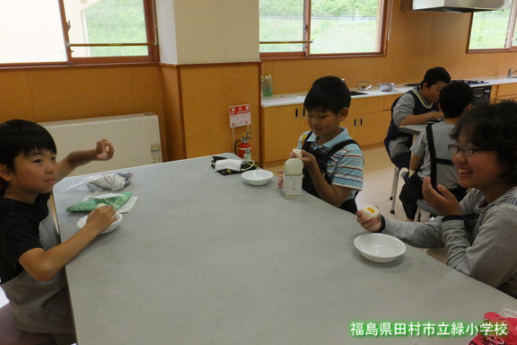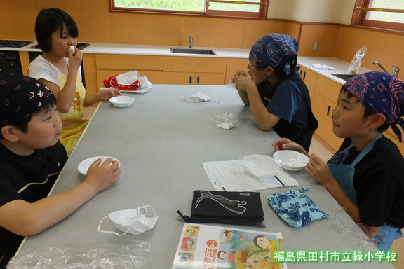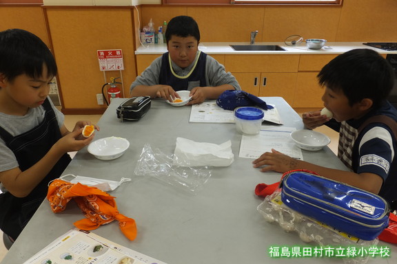 5年生は、調理実習「ゆでたまご」の試食中でした。