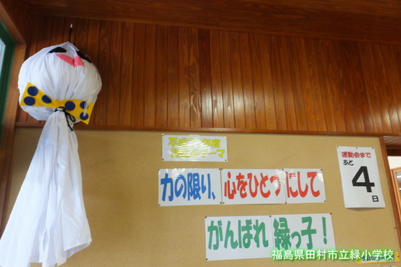 昇降口では、大きなてるてる坊主が、子ども達の登校を迎えています。