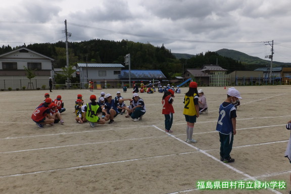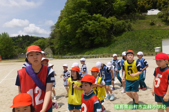 緑小学校は、全校生50人ほどの小規模校です。1年生から6年生までみんな仲が良く、天気のいい日には、みんなで元気に校庭で遊んでいます。学年に関係なく、一緒に鬼ごっこをしたりボール蹴りや一輪車をしています。鉄棒や雲梯で遊ぶお友達もいます。また、緑幼稚園が併設されており、幼・小連携のもと教育活動に取り組んでいます。