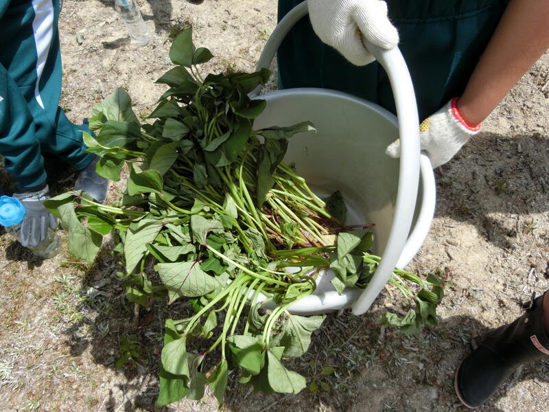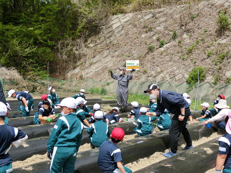 みどりの少年団の活動として、サツマイモの苗植えを行いました。幼稚園と小学校合同での作業です。みどりの指導員(佐藤さん)、コーディネーター(伊藤さん)のご指導のもと、1本1本丁寧に植えていきました。