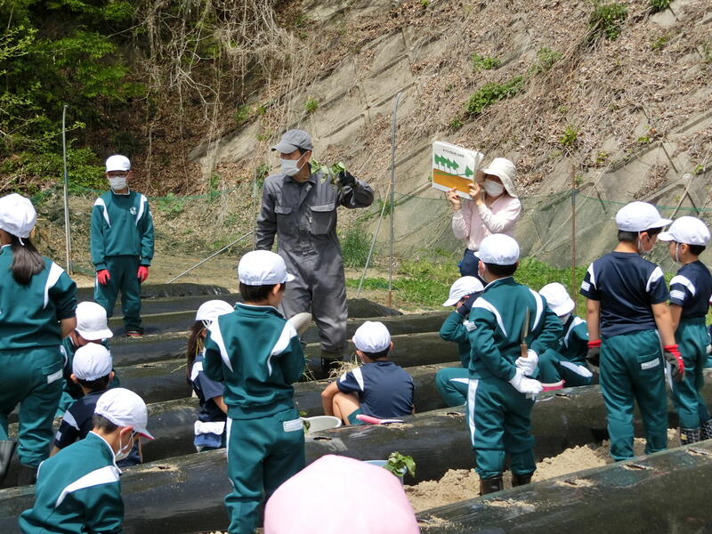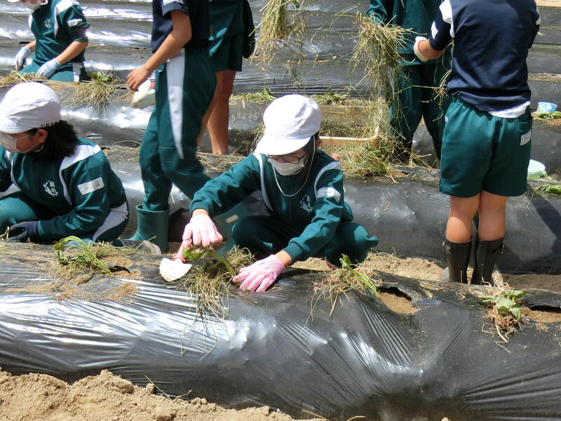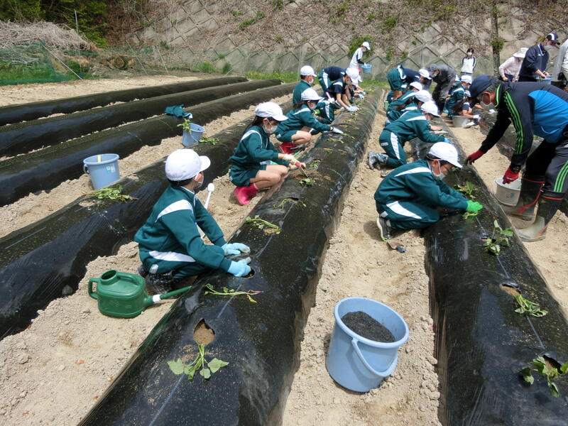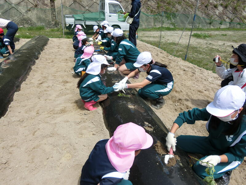 子どもたちは、自分の手で苗や土や草にふれながら、苗の植え方や保護の仕方等、多くのことを学んでいました。このような一つ一つの体験が結びつき、経験となって子どもたちの生きる力となっていくことを願っています。