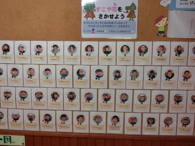 定期的に「振り返り」ながら継続的に取り組んでいきます。達成できた月は顔の周りの円にシールを貼っていきます。全ての円にシールが貼られると、「すこやか花」の完成です。