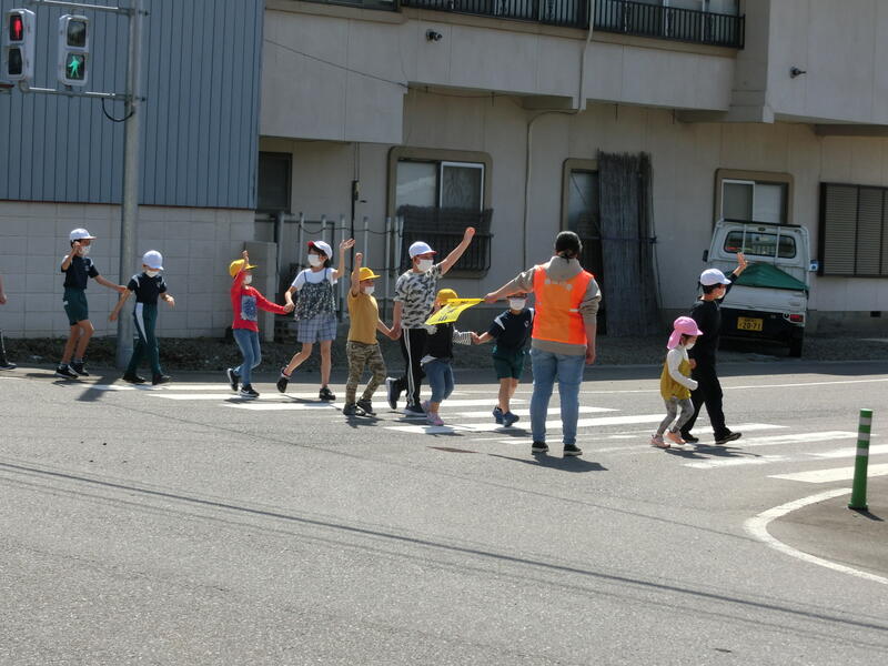 手を挙げて安全に渡ります。左右の安全確認も忘れずに。