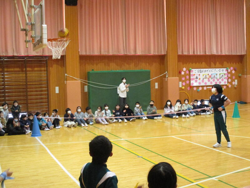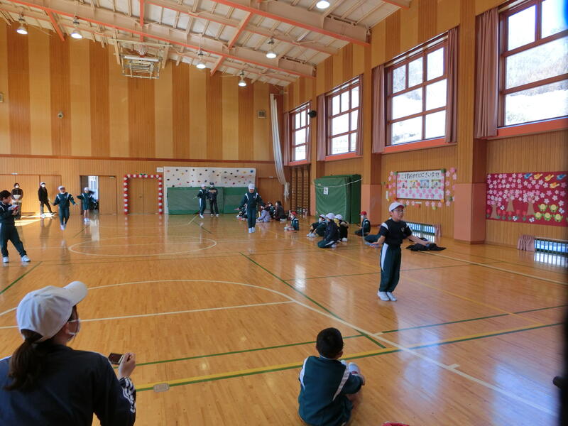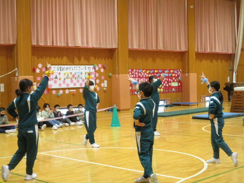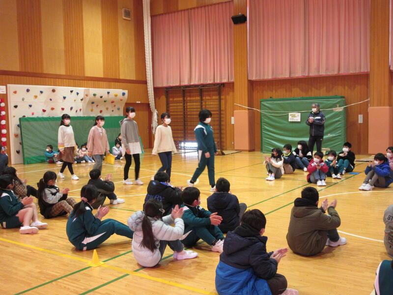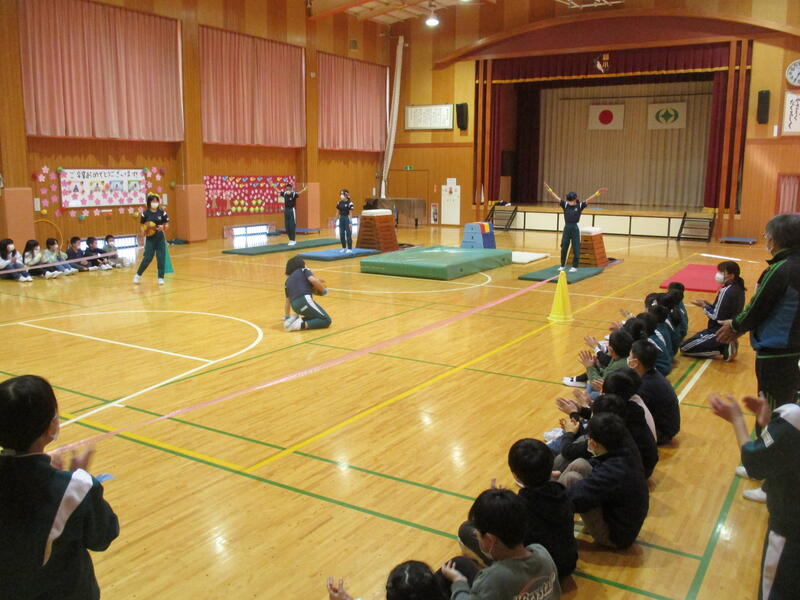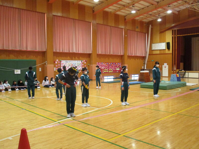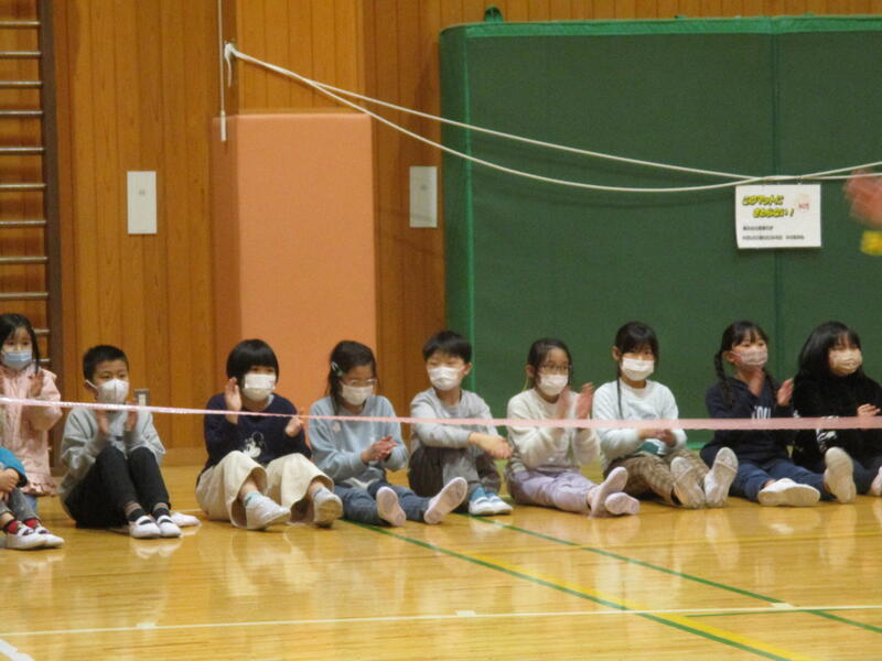 K・T(きずなタイム)で5・6年生の発表がありました。サーカス団に扮した5・6年生が、軽快な音楽に合わせて「跳び箱」や「マット運動」、「なわとび」、「バスケットボールのシュート」を披露しました。5・6年生の躍動感のある動きに会場も大いに盛り上がりました。